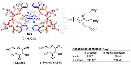 Davies and his team developed numerous synthetic lectins able to recognize multiple carbohydrate molecules. The design of carbohydrate hosts is challenging as the carbohydrate guest must reject water molecules from the cavity to establish new host–guest interactions which are very similar, i.e., both water and carbohydrate have hydroxyl groups. To approach this challenge, the authors designed cages with the correct size and shape to target carbohydrates (Figure 17). This design considered appropriate host and guest matches for polar regions (e.g., H-bond donor for H-acceptor, etc.) and hydrophobic surfaces [77]. Representative examples of these systems are described in Figure 5. For example, molecular cage C30 shows promise for binding carbohydrate substrates due to its tunable binding properties achieved by modifying the substituents of the biphenyl units. While glucose binding remains moderate using C30, the methoxy substituents enhance selectivity for β-methylglucoside [78].