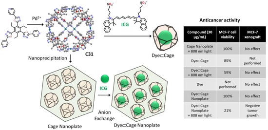 Nanoprecipitation–anion-exchange with indocyanine green of a Pd6L8 metal–organic cage with photodynamic antitumor therapy [79].