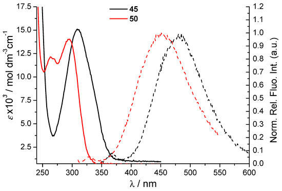 Another feasible spectroscopic property is solvatochromism, which can be employed in water-exclusion sensing [31,32] or lipid-membrane studies [33]. UV/Vis and fluorescence spectra were also taken in 1-octanol as a referent nonpolar solvent to evaluate potential solvatochromic effects. For both 45 and 50, emission in 1-octanol was hypsochromically shifted for 20 nm (Figures S116–S118); such a minor change is not applicable for fine water-content sensing.