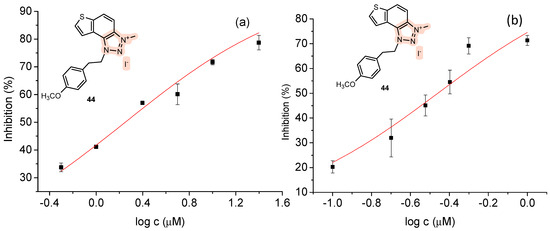 Dose–response curve for the inhibition of AChE (a) and BChE (b) by 44.