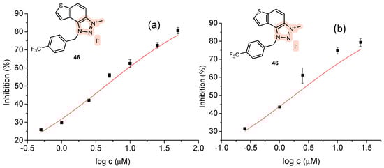 Dose–response curve for the inhibition AChE (a) and BChE (b) by via 46.