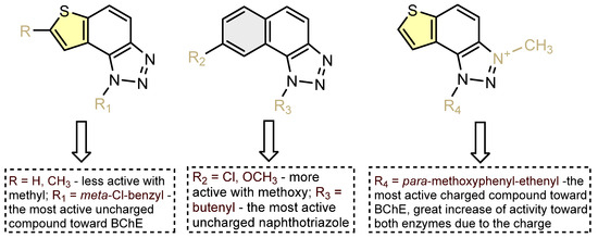 The obtained results were summarized in a structure–activity relationship overview (Figure 5). The key determinants in a structure–activity relationship are the type of (hetero)cyclic ring, the molecule’s geometry, the type of substituent, and the charge on the triazole ring.