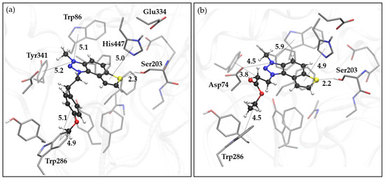 Both ligands have similar orientations, with the main molecular framework comprising thiophene, phenyl, and triazole rings positioned within a 5 Å distance from the esteratic active site (Ser203, Glu343, and His438). The sulfur from thiophene is positioned in proximity to the serine hydroxyl group, forming a weak hydrogen bond, and there is a π-π stacking between thiophene and His438. In both complexes, an energetically significant cation–π interaction is observed between the methyl-substituted triazole nitrogen and residue Trp86 of the anionic subsite.