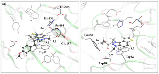 The docking of cations 44 and 45 into the active site of BChE yielded structures depicted in Figure 8. Notably, the main scaffolds did not adopt mutually similar orientations. In the complex formed between 44 and BChE, a cation–π interaction is evident between the triazolium nitrogen and Trp82 of the anionic site. Simultaneously, there is an electrostatic attraction between the methyl group at triazolium and Glu197, a residue also belonging to the anionic sub-domain (Figure 8a). While the scaffold of 45 is situated between Trp82 and the esteratic site, akin to the complex with 44, its orientation allows for the electrostatic attraction between the most positively charged part of the triazolium and residue Asp70, belonging to the PAS (Figure 8b). Additional stabilizing factors within these complexes involve the parallel π-π stacking between the thiophene and Trp82 in the complex with 44, whereas the complex with 45 features an alkyl–π interaction between the terminal ethyl group of the substituent and residue Tyr332.