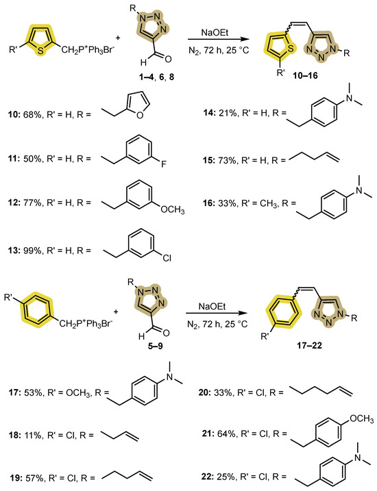 The Wittig reaction produced two configurational isomers, each of 1,2,3-triazolo-stilbenes 10–22, with different ratios of cis- and trans-isomers depending on the substituents. The obtained mixtures of isomers were purified by extraction and column chromatography, where the petroleum ether/ether (PE/E) solvent system of variable proportions was used. In the resulting mixture of isomers, the cis-isomer eluted first, and the trans-isomer last at almost the same rate as the traces of the starting aldehyde. The residual p-nitroaniline was successfully separated if it was introduced into the reaction mixture with aldehyde during the synthesis, which is also where it is formed. For the synthesis of triazolostilbenes 10–16, (thiophen-2-ylmethyl)triphenylphosphonium salt was used, while in the case of 17–22, the (4-methoxybenzyl)- or (4-chlorobenzyl)triphenylphosphonium, salt, along the addition of base sodium ethoxide, was used.