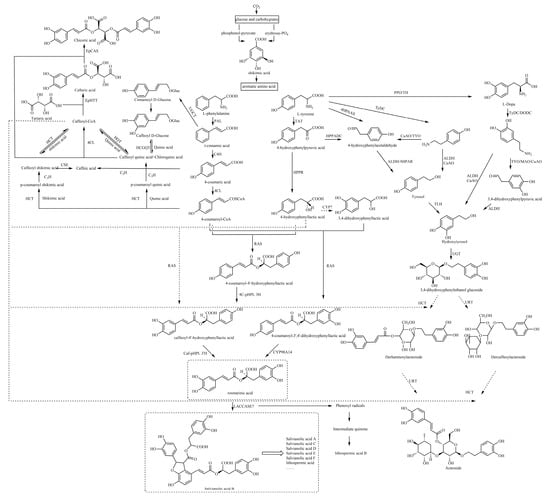 - Di, P.; Zhang, L.; Chen, J.; Tan, H.; Xiao, Y.; Dong, X.; Zhou, X.; Chen, W. ¹³C tracer reveals phenolic acids biosynthesis in hairy root cultures of Salvia miltiorrhiza. ACS Chem. Biol. 2013, 8, 1537–1548. [Google Scholar] [CrossRef] [PubMed]