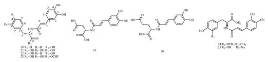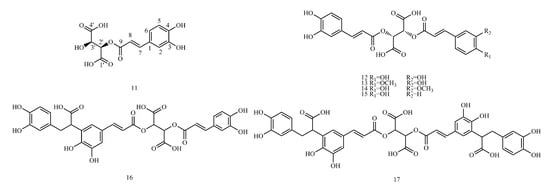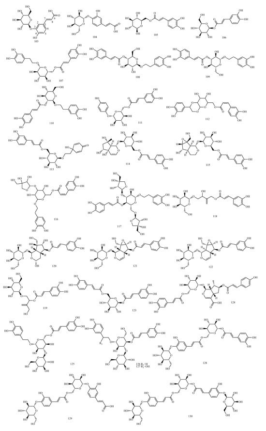 Therefore, 13C-NMR and 1H-NMR data (Tables S1–S18) and biosynthetic pathways (Figure 1) of 173 caffeic acid and its derivatives on plants with different types of substituents (Figure 2, Figure 3, Figure 4, Figure 5, Figure 6, Figure 7 and Figure 8 and Table 1, Table 2, Table 3, Table 4, Table 5, Table 6 and Table 7) were summarized to provide a reference for further research on the structural identification and biofabrication of caffeic acid and its derivatives.