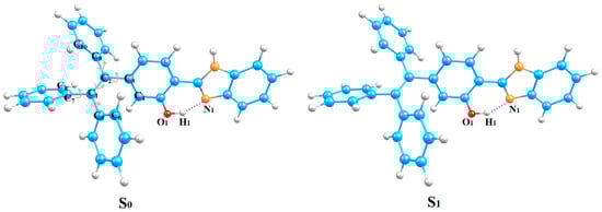 Optimized geometries of HTP-1 using the MN15/6-31G (d, p) method in S0 and S1 states; blue atom: C, orange atom: N, red atom: O, white atoms: H.