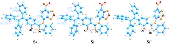 Optimized geometries of HTP-2 using the MN15/6-31G (d, p) method in S0, S1 and S1′ states; blue atom: C, orange atom: N, red atom: O, white atoms: H.