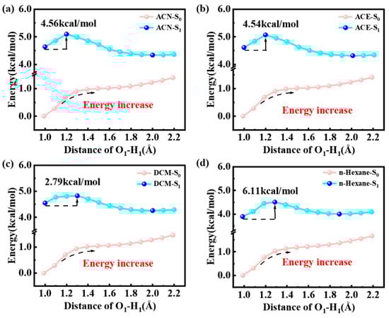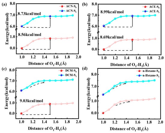 To explore the degree of difficulty of the ESIPT reaction for HTP-1 and HTP-2, we plotted the S0- and S1-stated PECs for HTP-1 and HTP-2 in four solvents by fixing the O1-H1 bond length. As shown in Figure 3, the high barrier and the consistently rising energy of HTP-1 in four solvents made the ESIPT process impracticable in the S1 state, indicating that the enol* configuration was more stable. In the S0 state, the energy of HTP-2 gradually increased with the extension of the O1-H1 bond length (see Figure 4). This indicated that the ESIPT reaction was not feasible in the S0 state. In the S1 state, the energy barriers were 4.56 kcal/mol (ACN), 4.54 kcal/mol (ACE), 2.79 kcal/mol (DCM) and 6.11 kcal/mol (n-Hexane). This result indicated that the ESIPT process tended to occur after photoexcitation. The energy barrier gradually increased with increasing solvent polarity in polar solvents (ACN, ACE and DCM), which was consistent with the order of HB strength. Whereas the energy barrier in nonpolar solvent (n-Hexane) was the highest. This result indicated that the ESIPT process of HTP-2 was more prone to occur in low-polarity solvents.