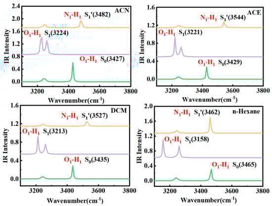 For HTP-1, the O1-H1 stretching modes from the S0 to the S1 state were blue-shifted in four solvents, resulting in the IHB intensity being weakened in the S1 state. The result illustrated that the ESIPT process of HTP-1 was not facile to occur. For HTP-2, the O1-H1 stretching modes were 3427 cm−1 (ACN), 3429 cm−1 (ACE), 3435 cm−1 (DCM) and 3465 cm−1 (n-Hexane) in the S0 state, which moved to 3224 cm−1, 3221 cm−1, 3213 cm−1 and 3158 cm−1 in the S1 state, respectively. Consistent with the geometric analysis, the red shifts in ACN (203 cm−1), ACE (208 cm−1) and DCM (222 cm−1) increased with decreasing solvent polarity. The result indicated that the order of the IHB strength was DCM > ACE > ACN. In addition, the new stretching vibrational mode N1-H1 was found to replace the original O1-H1 mode in the S1′ state, which situated at 3482 cm−1 (ACN), 3544 cm−1 (ACE), 3527 cm−1 (DCM) and 3462 cm−1 (n-Hexane), respectively. Through the above analysis, we found that the IHB strength of HTP-2 was enhanced in four solvents. These results were consistent with the above molecular configuration analysis.