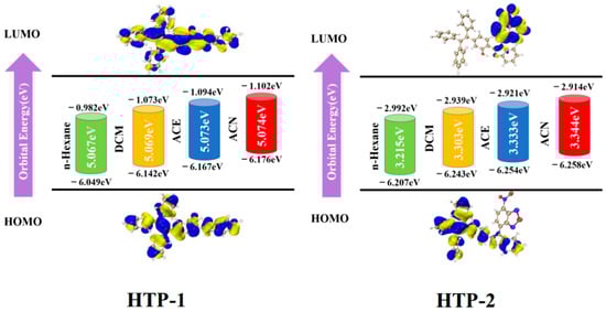 To explain this phenomenon, we performed the hole-electron analysis shown in Figure 10. The correlative indicators depicting the S1 and S1′ forms of HTP-1 and HTP-2 in four solvents were included in Table 5. The index D symbolizes the distance between the hole centroid and the electron centroid. The index D symbolizes the distance between holes centroid and electrons centroid, H reflects the overall average distribution width for holes and electrons, Sr describes the extent to which holes and electrons overlap and t represents the degree of separation between holes and electrons. In general, the larger the D index was, the lower the Sr index was and the more positive the t index was, which led to a more adequate separation of electrons and holes. Obviously, both D and t indices of HTP-2 were large, whereas the Sr indices were minimal (between 0.1 and 0.2). The above data indicated that the overlap of electrons and holes was small, which enhanced the ICT process of HTP-2. However, compared with that of HTP-2, the t index of HTP-1 was negative (−1.967). This implied that there was little separation between the distributions of holes and electrons. The hole-electron analysis also verified that HTP-1 did not undergo the ICT process and that the extremely small overlap of holes and electrons was the reason for the fluorescence quenching of HTP-2.