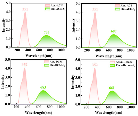 For HTP-1 (see Figure 8), the simulated absorption peak (351 nm) in ACN solvent was in agreement with the experimental data (348 nm). This indicated that the adopted MN15/6-31G (d, p) method was extremely reliable for further investigation of photophysical properties in other solvents. In addition, the absorption peaks were at 351 nm (ACE), 352 nm (DCM) and 352 nm (n-Hexane), implying that solvent polarity had little effect on them. The fluorescence peaks of the enol* form in ACN, ACE, DCM and n-Hexane corresponded to 733 nm, 687 nm, 683 nm and 661 nm, respectively. The result distinctly implied that the short wavelength Stokes shift was 309–382 nm and that the fluorescence of the HTP-1 came from enol* form. Meanwhile, for HTP-2 (see Figure 9), the absorption peaks in the four solvents were located at 352 nm (ACN), 352 nm (ACE), 354 nm (DCM) and 356 nm (n-Hexane). Moreover, the fluorescence of the enol* and keto* states for HTP-2 was quenched, which was consistent with the fact that no fluorescence was observed in the experiment [42].