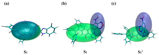 Hole-electron analysis (green and blue regions represent electrons and holes, respectively) in ACN. (a) S1 form of HTP-1, (b) S1 form of HTP-2 and (c) S1′ form of HTP-2.
