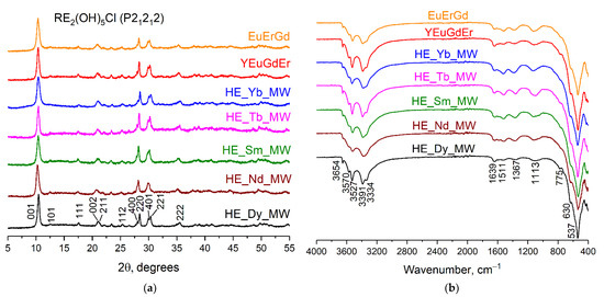 (a) Diffraction patterns and (b) FT-IR spectra of the multicomponent layered rare earth hydroxychlorides: ternary (EuErGd), quaternary (YEuErGd), and quinary (HE_RE_MW, where RE = Nd/Sm/Tb/Dy/Yb).