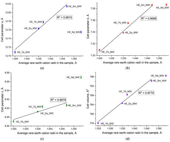 (a–c) Unit cell parameters (a–d) unit cell volume as functions of the average rare earth cation radius in high-entropy (five-component) layered rare earth hydroxychlorides HE_RE_MW (RE = Nd/Sm/Tb/Dy/Yb).