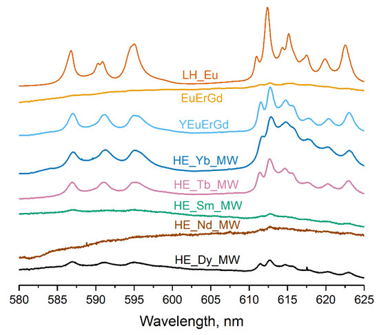 Figure 5 presents the luminescence spectra of the multicomponent layered rare earth hydroxychlorides. All synthesised samples contained a europium cation, which re-emits electromagnetic energy in the visible region of the spectrum. The spectrum of the layered europium hydroxychloride LH_Eu shows typical luminescence bands of Eu3+ (580–650 nm). The ternary layered rare earth hydroxychloride (EuErGd) scarcely luminesced, probably because of efficient luminescence quenching caused by energy transfer from europium to erbium [30]. In contrast, the quaternary layered rare earth hydroxychloride (YEuErGd) showed prominent europium luminescence. This could be attributed to the addition of yttrium, which dilutes the other rare earth cations and reduces the energy transfer from Eu3+ to Er3+. As a result, europium luminescence in this compound was more intense than in the ternary layered hydroxychloride. For the high-entropy (five-cation) layered hydroxychloride, the intensity of the europium luminescence depends on the choice of the fifth variable cation. The efficient transfer of energy from the terbium cation to europium [30] resulted in stronger luminescence in the HE_Tb_MW sample. In turn, Yb3+ quenches the luminescence of europium, but this process is not very efficient because Yb3+ lacks resonance levels [30]. Therefore, the spectrum of the HE_Yb_MW sample contains well-defined luminescence bands of europium. The energy transfer from Eu3+ to Nd3+, Dy3+, or Sm3+ was highly efficient [30], leading to the quenching of europium luminescence in the HE_Nd_MW, HE_Dy_MW, and HE_Sm_MW spectra. Similar results were reported for high-entropy layered rare earth hydroxynitrates with identical cationic compositions [19]. Thus, the luminescence spectra provide evidence of energy transfer among rare earth cations in the synthesised multicomponent layered hydroxychlorides. This proves that different rare earth cations were uniformly distributed in the samples.