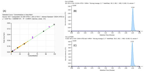 An example of a calibration curve with linearity data (A) and chromatographic peaks of Vit D (B) and its Internal Standard (C) performed with LC-MS/MS, used for the comparative performance assessment, is shown in Figure 1.