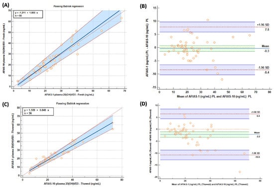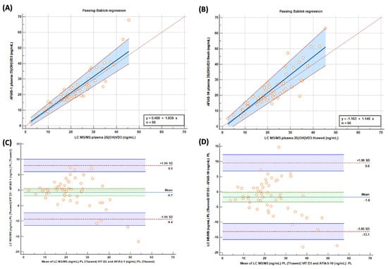 Passing–Bablok and (A,B) Bland–Altman (C,D) graphs comparing “fresh” samples tested with AFIAS-1(A) and AFIAS-10(B) with LC-MS/MS method.