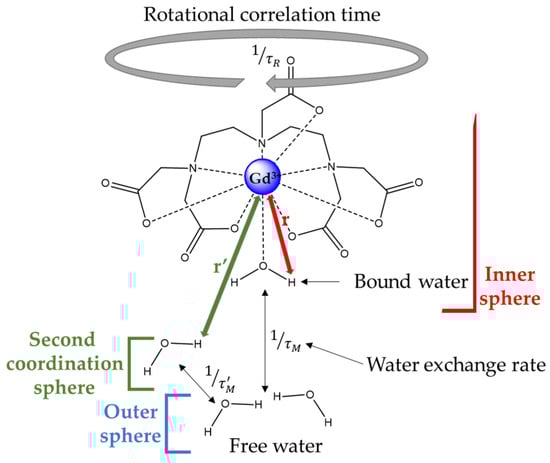 Relaxivity depends on three mechanisms: (i) the inner sphere, which corresponds to the first coordination sphere of the metal containing one or several coordinated water molecule(s), (ii) the outer sphere, corresponding to the bulk water diffusing in the close vicinity of the complex, and (iii) the second sphere, coming from water molecules slightly bound to the complex through hydrogen bonds, for example. Since the outer sphere’s mechanism mainly depends on the diffusion of water, it cannot be easily tuned to increase the relaxivity, as only a temperature changes could significantly modify this diffusion. Concerning the inner sphere’s mechanism, it is of quantum mechanics origin and is governed by both scalar and dipolar interactions between the nuclear spins of water molecules and the orbital spins of the f or d-layer electrons of the paramagnetic center. The scalar interaction is negligible for all the Gd complexes and for most of the Mn-complexes [8], so only the dipolar contribution will determine the inner sphere’s mechanism. It is given by Equation (2), where q is the number of coordinated water molecule(s), τM is the residence time of these coordinated water molecules, and T1m is the longitudinal relaxation time of the coordinated water molecule, as defined by Equation (3), according to the paramagnetic relaxation theory of Solomon–Bloembergen–Morgan.