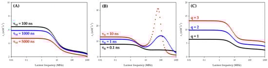 Influence of (A) τM; (B) τR; and (C) q on NMRD profiles of small Gd complexes.