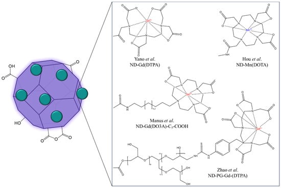 Structures of some ND-based contrast agents discussed in this work (ND-Gd(DO3A) [26,27] ND-Gd(DTPA) [28] ND-Mn(DOTA) [29]; and ND-PG-Gd(DTPA) [30]).