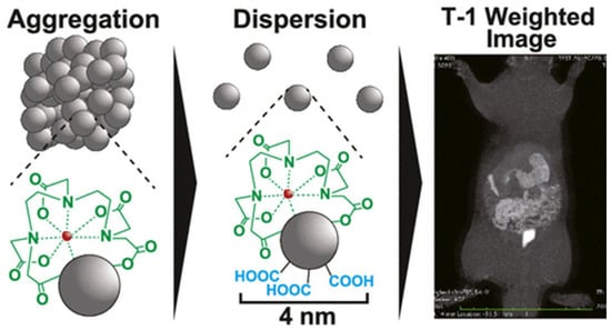 CNTs are classified into single-walled carbon nanotubes (SWCTs) and multi-walled carbon nanotubes (MWCTs), according to the number (single or multiple) of graphene sheets that form the cylindrical tube. This material is produced using electric arc discharge, laser ablation, or chemical vapor deposition. From a structural point of view, CNTs are composed of fullerene hemisphere (tips) and curved graphite (sidewalls). Besides CNTs’ applications as drug delivery systems [64], various researchers have focused on biomedical imaging applications of functionalized carbon nanotubes [65,66,67]. Similarly to gadonanodiamond, carbon nanotubes have been chelated directly with Gd3+ chelates (referred to as gadonanotubes). Servant and co-workers [46] developed a gadolinium-functionalized MWNT as a T1-weighted contrast agent for MRI cell labelling and tracking. Their system was covalently functionalized using a conventional gadolinium chelating agent (DTPA) grafted onto the acid-treated nanotube surface (Figure 7).