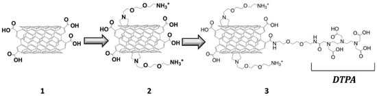 Illustration of DTPA-functionalized MWNT developed by Servant et al. (Reprinted with permission from [46]). The carboxylated MWNT (1) are modified through 1,3 dipolar cycloaddition in order to introduce amine functions (2), which then react with DTPA via peptidic chemistry (3).
