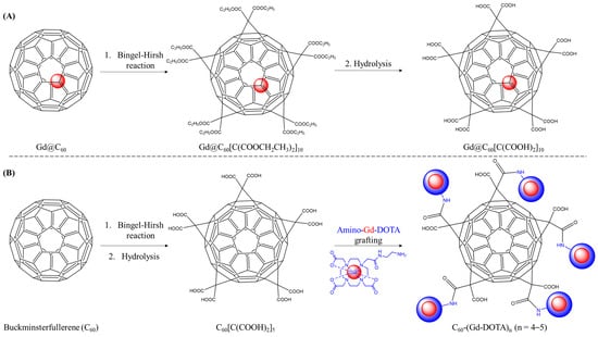 Illustration of the two general strategies for the preparation of water-soluble gadofullerenes derivatives as MRI contrast agents. (A) Strategy for the preparation of endohedral gadofullerenes, as described by Bolskar et al. [50]; (B) strategy for the preparation of surface-modified fullerenes, as described by Wang et al. [54].
