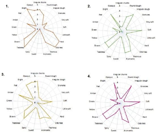 Sensory characteristics of raw propolis from (1) Algeciras, (2) Quebradon, (3) Otás, and (4) Arcadia from Huila, Colombia.