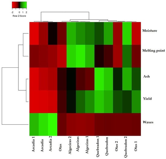 To verify how the results of the physicochemical parameters allow us to classify and differentiate the four propolis evaluated, Figure 2 shows the heat map graph that shows the hierarchical structure of the cluster simultaneously as the propolis samples and the physicochemical variables (rows and columns, respectively), where three distribution groups are presented. The first group represents the direct relationship between humidity and melting point, where both variables are associated with the quality of the product and the process of propolis collection, handling, and production. The second group represents the variables determination of ashes and waxes, which are associated with the quality of propolis about the amount of impurities, plant material, and adulteration of the product that reduces the amount of bioactive compounds of the EEPs. The third group is the performance parameter directly related to the other two groups.