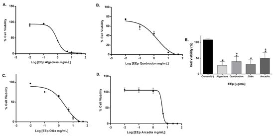 Dose–response curves of the effect on the viability of EEP cells from propolis samples in the L929 cell line. The cells were treated for 48 h with different concentrations (0.01–50 mg/mL). (A) Algeciras, (B) Quebradon, (C) Otás, (D) Arcadia. (E) Comparison of the IC50 of the extracts in the L929 cell line. The results are the average of three independent tests with three repetitions (n = 3) ± standard error of the mean (SME). (#) represents the significant differences in the IC50 of each extract compared to the control group (untreated cells) and (*) represents the significant differences comparing the IC50 between the propolis samples.