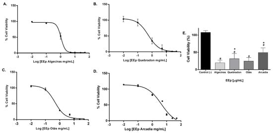 Dose–response curves of the effect on the viability of EEP cells from propolis samples in the GHnF cell line. Cells were treated for 48 h with different concentrations (0.01–50 mg/mL). (A) Algeciras, (B) Quebradon, (C) Otás, (D) Arcadia, (E) comparison of the IC50 of the extracts in the HGnF cell line. The results are the average of three independent tests with three repetitions (n = 3) ± standard error of the mean (SME). (#) represents the significant differences in the IC50 of each extract compared to the control group (untreated cells), and (*) represents the significant differences comparing the IC50 between the propolis samples.