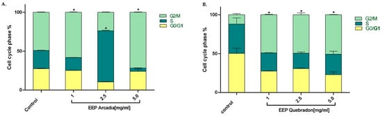 Effect of propolis extracts from Arcadia (A) and Quebradon (B) on the cell cycle in HGnF cells. Cells were treated at 1.0, 2.5, and 5.0 mg/mL extract for 48 h. The results are the average of three independent tests in duplicate (n = 6) ± SME. The effects of the extracts were compared with the control (untreated cells) * p < 0.05.