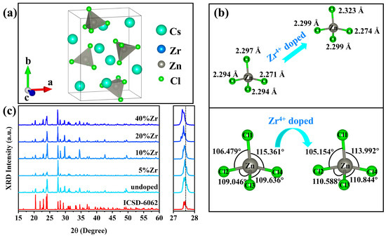 Pure Cs2ZnCl4 and Zr4+-doped Cs2ZnCl4 crystal samples were prepared by the solvothermal method using cesium chloride, zinc chloride, and zirconium chloride. Crystallographic data indicated that Cs2ZnCl4 belonged to the orthorhombic Pnma space group and had a typical 0D structure. In each [ZnCl4]2− tetrahedron, one Zn2+ ion occupied the central position and four Cl− ions were connected to it to form a highly symmetrical tetrahedral geometry, as shown in Figure 1a. Each [ZnCl4]2− tetrahedron was distributed in isolation and the distance between two adjacent tetrahedrons was 6.6 Å (calculated based on the Zn2+ ion distance). The tetrahedrons exhibited a typical 0D structure at the molecular level. Cs+ ions served as a supporting framework and charge balance in the structure. As shown in the upper part of Figure 1b, the bond length of the Zn-Cl bond was between 2.271 Å and 2.297 Å in each [ZnCl4]2− tetrahedron. The bond length range of the Zn-Cl bond in the [ZnCl4]2− tetrahedron changed to 2.274 Å~2.323 Å after Zr4+ ions were introduced into the lattice of Cs2ZnCl4. Compared with undoped Cs2ZnCl4, the introduction of Zr4+ ions significantly increased the bond length of the Zn-Cl bond, which showed that the tetrahedral distortion in the doped system was greater than the undoped system. In addition, the bond angles of the four Cl-Zn-Cl also changed significantly after Zr4+ doping. In the undoped system, the bond angles of Cl1-Zn-Cl2, Cl2-Zn-Cl3, Cl3-Zn-Cl4, and Cl1-Zn-Cl4 were 106.479°, 109.046°, 109.636°, and 115.361°, respectively. After the introduction of Zr ions, the Cl1-Zn-Cl2 and Cl1-Zn-Cl4 bond angles decreased, while the Cl2-Zn-Cl3 and Cl3-Zn-Cl4 bond angles increased, as shown in the lower part of Figure 1b. The significant structural differences between the undoped system and the doped system also provide evidence that Zr4+ ions replaced a small part of the Zn2+ ions lattice. At the same time, this significant difference also showed the stronger distortion of the crystal lattice after Zr4+ doping, and easily generated the strong electron–phonon coupling effects under excitation, which is an intrinsic condition for efficient light emission [27,28,29].