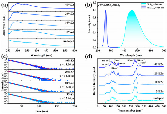 (a) Absorption spectra of Cs2ZnCl4 with different Zr4+ feed ratios. (b) Normalized PLE (with the monitoring wavelength at 457 nm) and PL (under the excitation wavelength at 260 nm) spectra of 20%Zr4+:Cs2ZnCl4. (c) PL lifetime of Cs2ZnCl4 with different Zr4+ feed ratios monitored at 260 nm. (d) Raman spectra of Cs2ZnCl4 with different Zr4+ feed ratios under the excitation of a 630 nm laser.