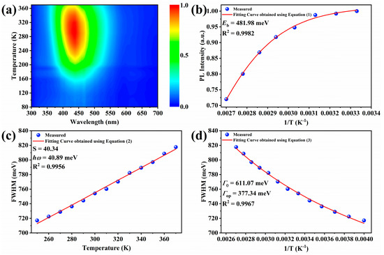 In addition, several key physical parameters, such as the Huang–Rhys factor (S), the exciton binding energy (Eb), and the electron–optical-phonon coupling energy (Γop) were obtained by fitting the temperature-dependent PL spectrum. These physical parameters help to understand the underlying photophysical mechanism in Zr4+:Cs2ZnCl4. First, the exciton binding energy of the Zr4+:Cs2ZnCl4 was fitted using the following formula [38]: