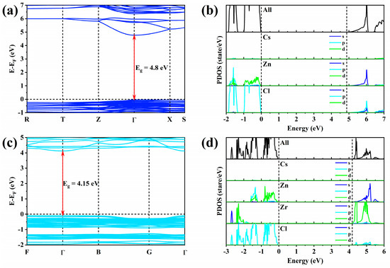 (a) Bandgap structure of undoped Cs2ZnCl4. (b) DOS of undoped Cs2ZnCl4. (c) Bandgap structure of Zr4+:Cs2ZnCl4. (d) DOS of Zr4+:Cs2ZnCl4.
