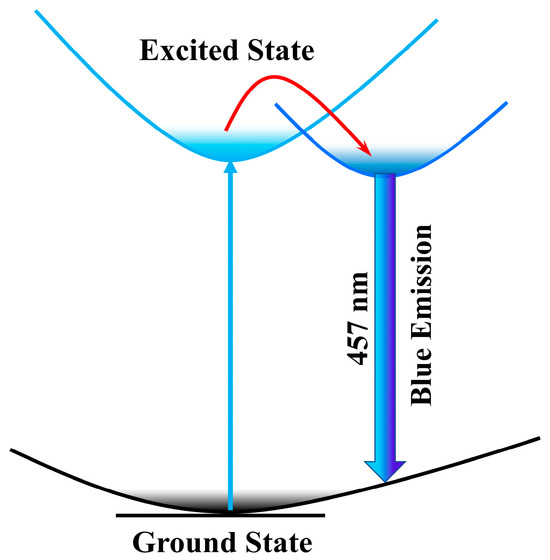 As shown in Figure 5, ground state electrons absorbed energy and transited to the excited state under UV excitation. Due to the soft lattice properties of Zr4+:Cs2ZnCl4, the lattice deformed rapidly after being excited and bound the excited electrons to specific sites in the lattice. The bound electrons then radiated photons outward through radiative recombination and produced bright blue-light emission.