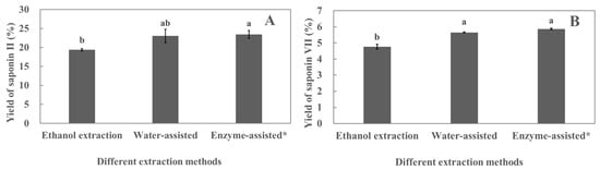 Effect of different extraction methods on the yields of polyphyllin II (A) and polyphyllin VII (B). * indicates that the enzyme used pectinase, and the concentration of the pectinase solution is 0.5 mg/mL. Different lower cases above the columns indicate significant differences between saponin yields (p < 0.05). Each value is the mean of triplicate measure, n = 3.
