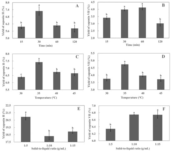 Effect of different extraction periods on the yields of polyphyllin II (A) and polyphyllin VII (B); effect of different extraction temperatures on the yields of polyphyllin II (C) and polyphyllin VII (D); effect of different solid-to-liquid ratios on the yields of polyphyllin II (E) and polyphyllin VII (F). Different lower cases above the line graph indicate significant differences between saponin yields (p < 0.05). Each value is the mean of triplicate measure, n = 3.