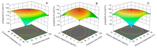 Response surface curve plots of the interactive effects of different factors on polyphyllin II yield: (A) interaction between extraction time and extraction temperature; (B) interaction between solid-to-liquid ratio and extraction time; (C) interaction between solid-to-liquid ratio and extraction temperature.