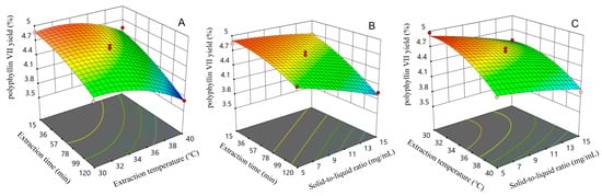 Response surface curve plots of the interactive effects of different factors on polyphyllin VII yield: (A) interaction between extraction time and extraction temperature; (B) interaction between solid-to-liquid ratio and extraction time; (C) interaction between solid-to-liquid ratio and extraction temperature.