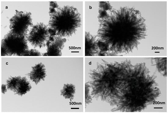 The morphologies of PDA-UTMS and Cu-PDA-UTMS were firstly characterized by transmission electron microscopy (TEM). As seen in Figure 1a,b, the polydopamine-coated titanate microspheres show a good sea urchin-like shape formed by the clustering together of countless tubular structures, which provide a rich specific surface area for binding more copper ions. As displayed in Figure 1c,d, after the coating of copper ions onto the polydopamine-coated titanate microspheres, the material still exhibits a good sea urchin-like shape, which provides a rich specific surface area for binding more target proteins. In addition, in the TEM element mapping of Cu-PDA-UTMS (Figure S1), C, Cu, N, O, and Ti are uniformly distributed on titanate microspheres, respectively, which proves the success of polydopamine encapsulation and the coating of copper ions onto titanate microspheres.