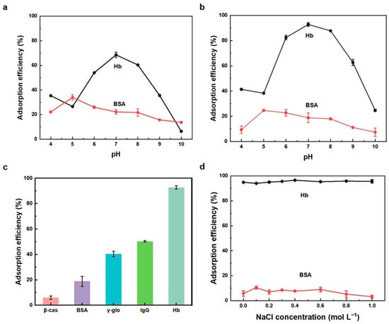 In order to better evaluate the adsorption selectivity by Cu-PDA-UTMS, several proteins, including β-casein (β-cas), bovine serum albumin (BSA), immunoglobulin G (IgG), γ-globulin (γ-glo), and hemoglobin (Hb) were tested. A total of 0.1 mg Cu-PDA-UTMS was applied to adsorb these proteins (1.0 mL, 100 mg L−1, pH 7). From Figure 4c, the adsorption efficiencies of Cu-PDA-UTMS for β-cas, BSA, IgG, γ-glo, and Hb were 6.0%, 18.8%, 40.4%, 50.4%, and 92.8%, respectively. These results showed that the adsorption efficiency for Hb by Cu-PDA-UTMS was better than that for other proteins, which was attributed to the strong metal affinity between hemoglobin and copper ions on the surface of the adsorbent.