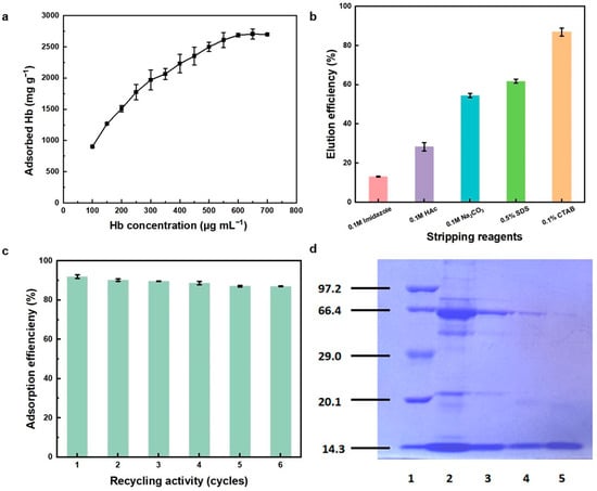 The study of the protein’s adsorption behavior under different pH conditions, salt concentrations, and so on has proven its good potential for use. Next, the practicability of Cu-PDA-UTMS in the selective adsorption of hemoglobin was tested by using diluted human whole blood without other processing as a biological sample. Specifically, 0.1 mg Cu-PDA-UTMS was used to enrich 100-fold dilutions human whole blood samples diluted in 0.04 mol L−1 BR buffer (pH 7), after which the protein was bound by the adsorbent and eluted by 0.1% CTAB. The adsorption and elution of proteins were analyzed by SDS-PAGE with separation gel (12%) under 80 V and laminated gel (5%) under 120 V. As shown in the SDS-PAGE results (Figure 5d), these bands of the 100-fold diluted human whole blood sample (lane 2) contain mainly serum albumin (66.4 kDa) and α or β globin chains of Hb (14.3 kDa). After the elution of adsorbed proteins from Cu-PDA-UTMS, lane 4 showed that the supernatant mostly contained the band of corresponding α or β globin chains of Hb at 14.3 kDa. As a comparison, the band for the 0.1 mg mL−1 hemoglobin standard was also shown (lane 5). From SDS-PAGE analysis, it can be seen that the proportion of hemoglobin enriched from blood is significantly higher than that of human whole blood samples before enrichment. The results further indicated that Cu-PDA-UTMS displayed good selectivity for Hb and could be a promising candidate for selective separation of Hb from complicated biological samples. As we know, the hemoglobin purification/separation is a multi-stage process where the number of purification steps depends on application of the isolated hemoglobin (diagnostic reagent, food additive, cell culture additive, or therapeutic agent or it just needs to be removed due to interference with the molecules to be analyzed). In light of our results, this new adsorber, with proven good characteristics, can be used as one step in the complex hemoglobin purification process.