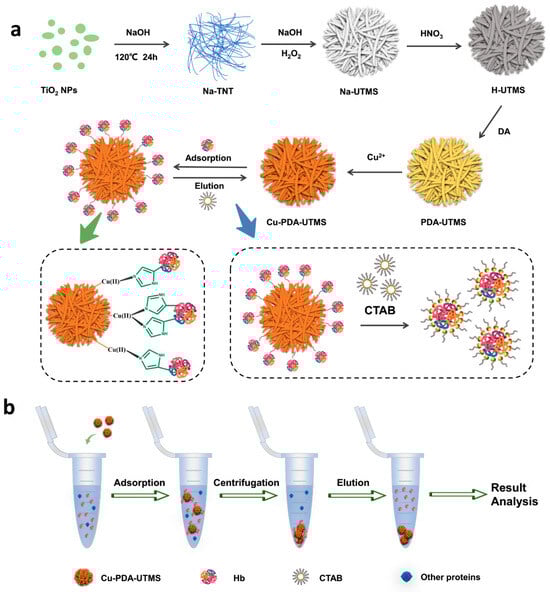 Synthetic route of Cu-PDA-UTMSs (a), and the adsorption/desorption procedure (b) for hemoglobin by Cu-PDA-UTMS.
