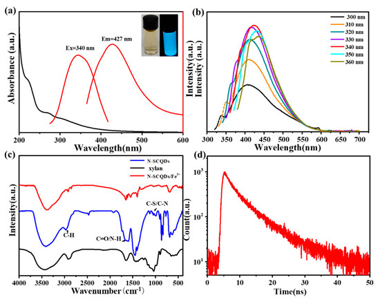 The fluorescence properties of N-SCQDs were comprehensively characterized by fluorescence excitation, emission and attenuation spectra. As shown in Figure 1a, its fluorescence excitation wavelength was centered around 340 nm, and the excited emission wavelength was 427 nm. The emitted fluorescence was affected by the wavelength of excitation light. With the increase of excitation wavelength, the emitted fluorescence gradually redshifted, and the maximum fluorescence was excited by light of 340 nm (Figure 1b). Using quinine sulfate as the standard, the fluorescence quantum yield of N-SCQDS was 24.6%. Compared with xylan, the functional groups of N-SCQDs were different due to the doping of nitrogen and sulfur elements. According to their FT-IR spectrum (Figure 1c), except for the significant enhancement of the peak at 1408 cm−1 (C-OH) and 1687 cm−1 (C=O), there was additional peaks near 1205 cm−1, which may be attributed to the stretching vibration of C-N and C-S [21]. All these indicated that N-SCQDs contained abundant functional groups. When Fe-trivalent ions were added to N-SCQDs, the peak at 1408 cm−1 (C-OH), 875 cm−1 (C=C) and 1687 cm−1 (C=O) decreased significantly. This may be because the hydroxyl group and the carboxyl group have some chelating effect on the trivalent iron ion. According to the time-resolved fluorescence attenuation curve (Figure 1d), the attenuation curve was fitted as I(t) = 526(−t/2.27) + 396(−t/7.78) [22], it was calculated that the average fluorescence life of N-SCQDs was 6.98 ns.
