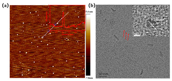 (a) AFM image of N-SCQDs and height distribution of the white line region in (a). Brown represents the background and white dots represent the quantum dots; (b) TEM image of N-SCQDs and HRTEM image of N-SCQDs.