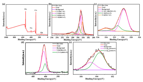 (a) XPS spectrum of N-SCQDs; high-resolution XPS spectra of (b) C1s, (c) O1s, (d) N1s and (e) S2p.
